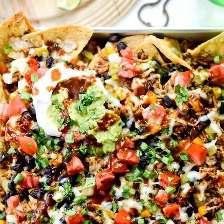 Deep Dish Black Bean Chicken Chorizo Nachos