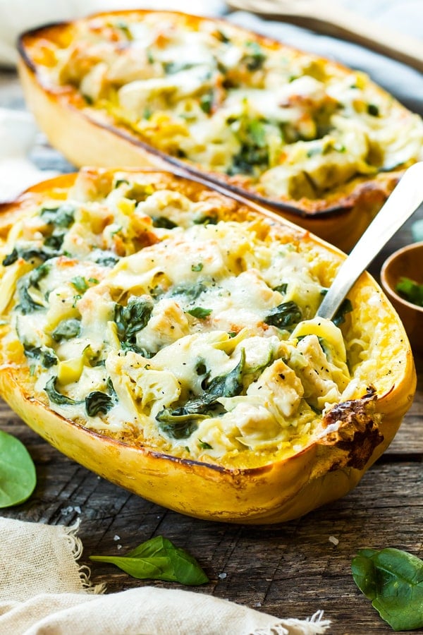 Spinach Artichoke Spaghetti Squash Boats With Chicken