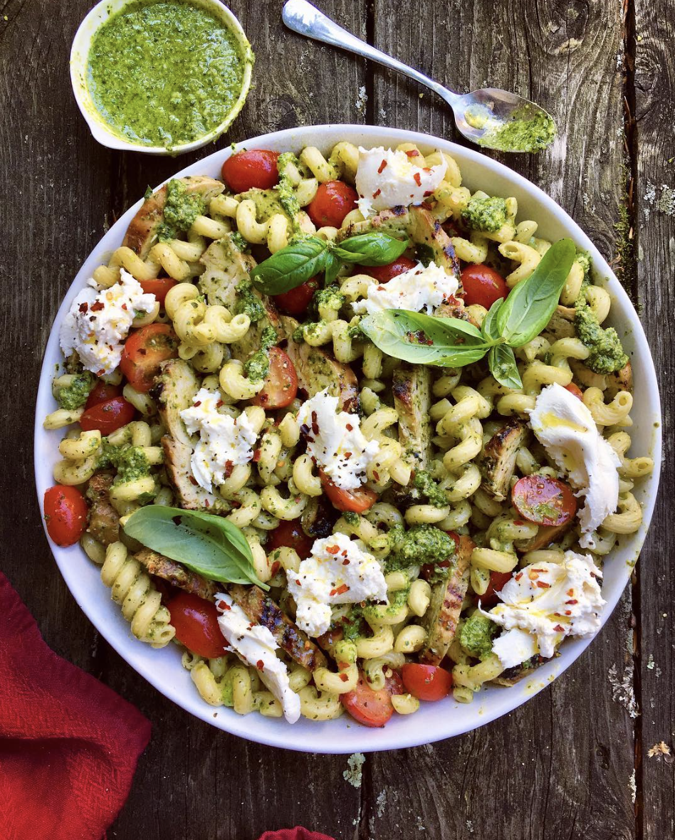 Pesto Pasta With Grilled Chicken Cherry Tomatoes And Burrata