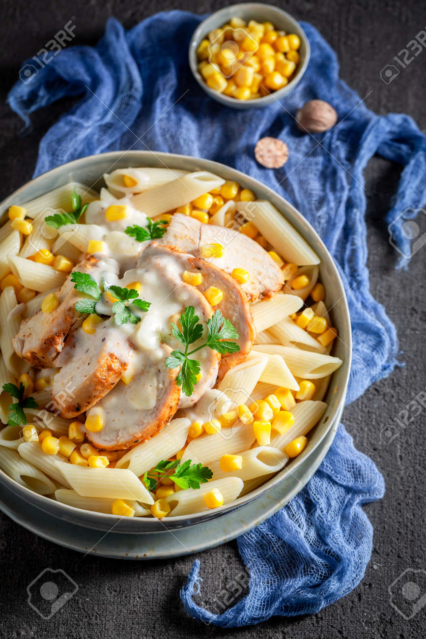 Tasty Pasta With Chicken Corn And Bechamel Sauce