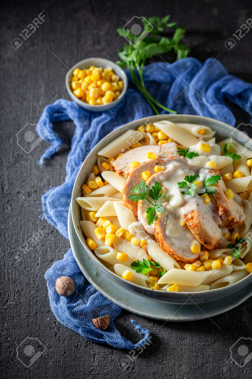 Tasty Penne With Bechamel Sauce Corn And Chicken