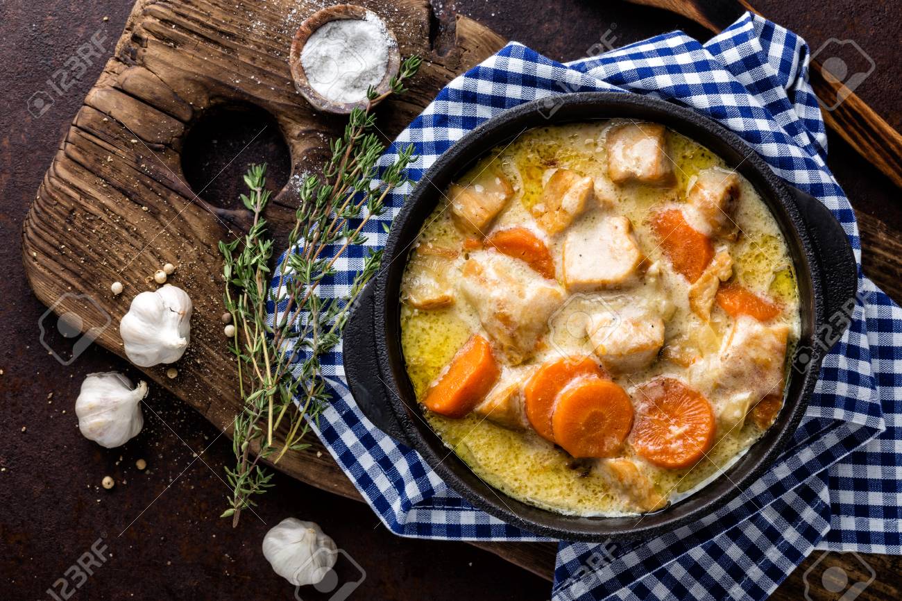 Meat Stew Chicken Fillet In Sauce With Carrot In A Cast Iron