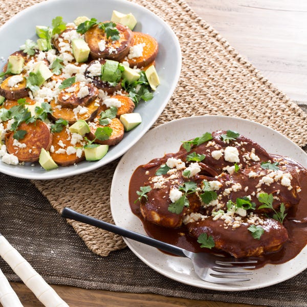 Chicken Mole With Sweet Potatoes Avocado Queso Fresco