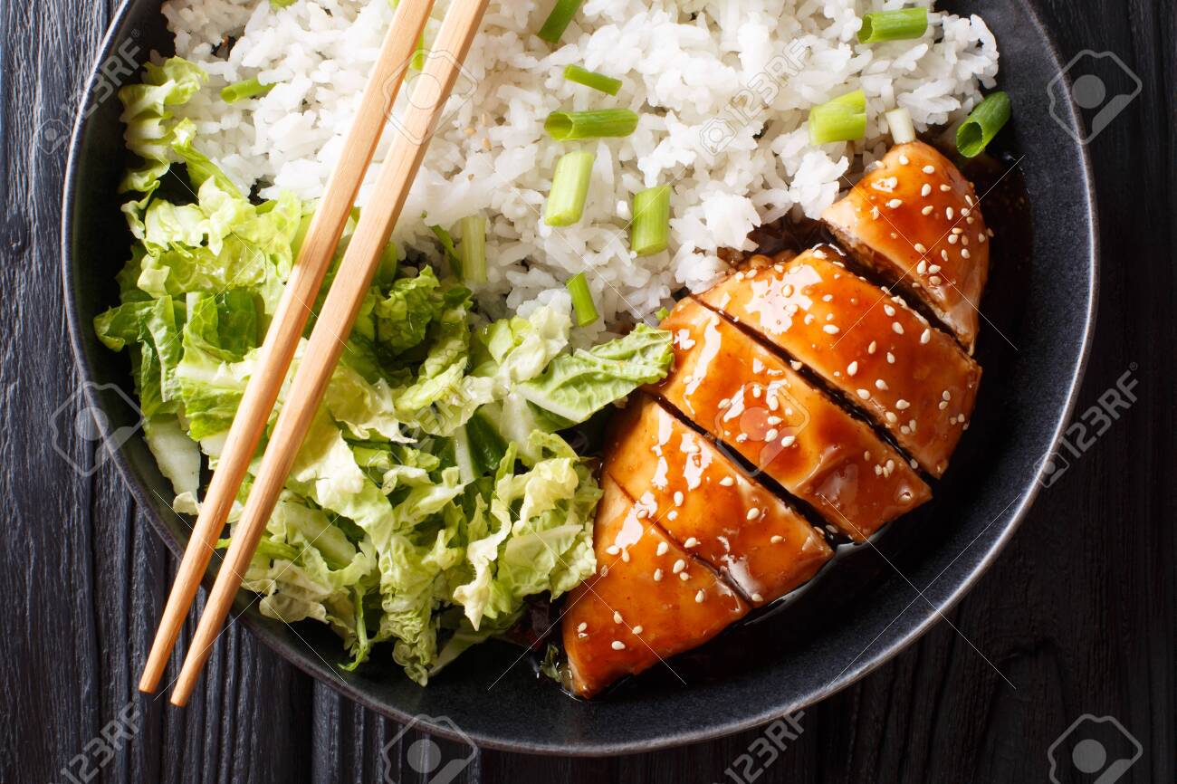 Portion Of Teriyaki Chicken Fillet With Rice And Lettuce Close Up