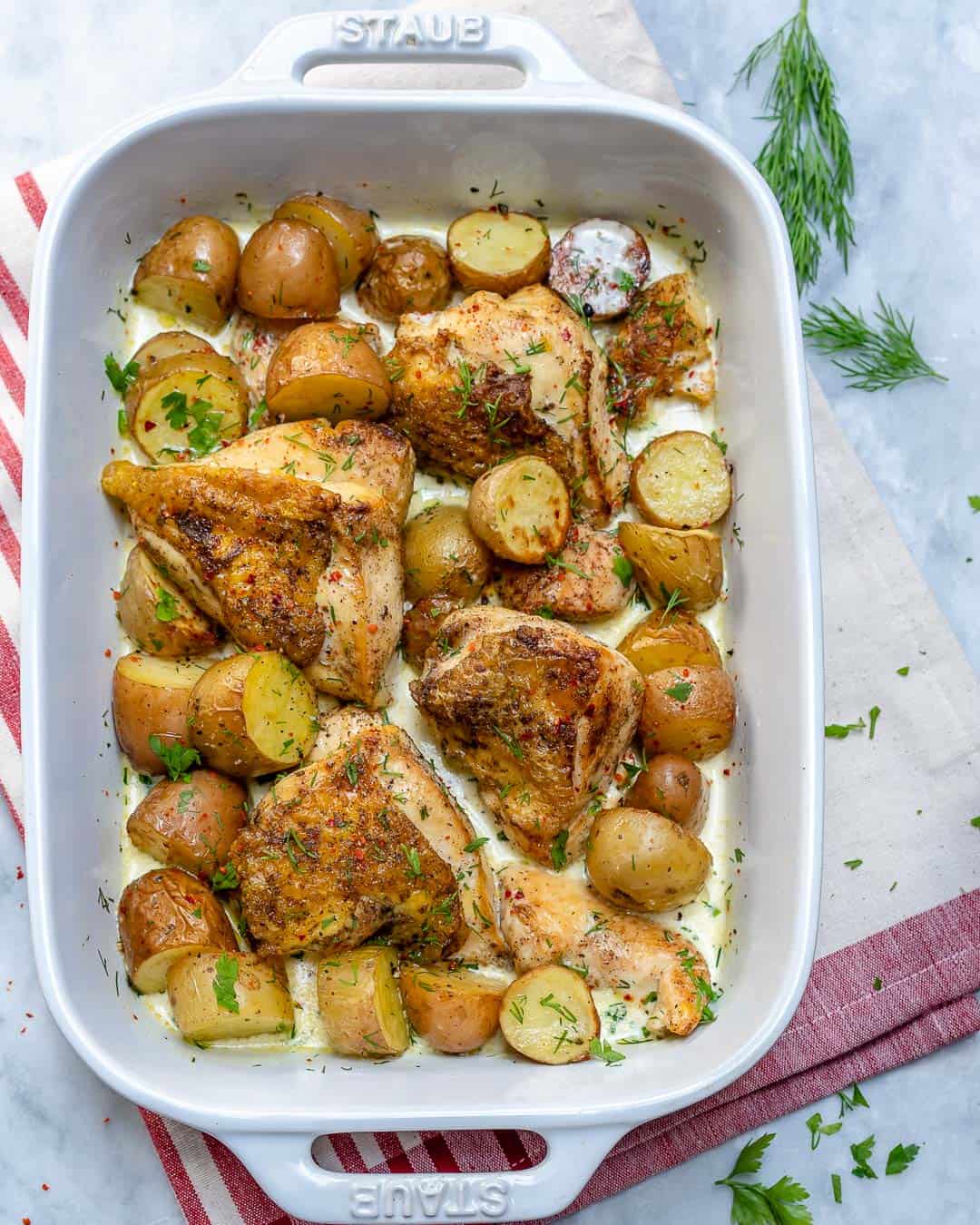 Serve the baked chicken and potatoes with vegetables or with a salad to make it a complete meal. Coat a large baking dish with vegetable or butter spray pam. 3 dashes ground black pepper.