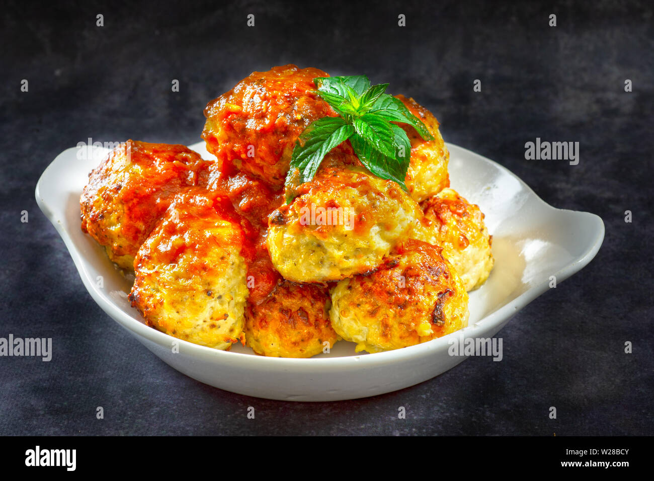 Chicken Meatballs In Tomato Sauce In A White Bowl Grungy