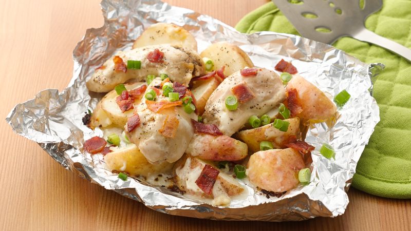 14 cup real bacon crumbles. Place a chicken breast on top of potatoes. When making chicken and potatoes foil packets in the oven you need to first preheat the oven or grill to 400 degrees fahrenheit.