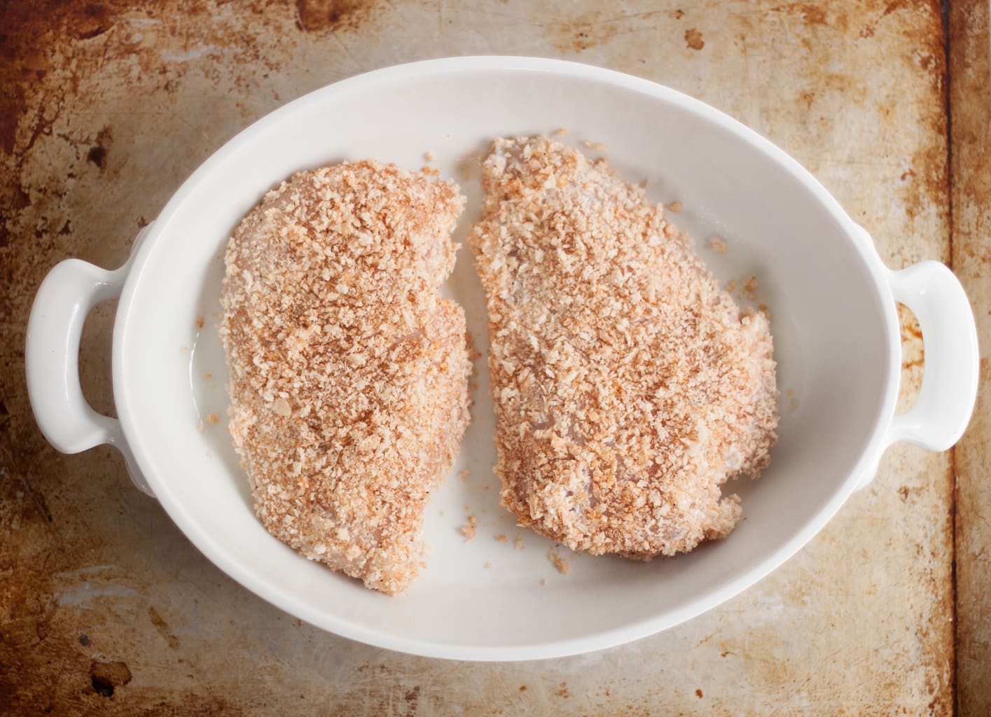 Add chicken 2 pieces at a time to crumb mixture and coat evenly on both sides pressing chicken into crumbs to help them adhere then transfer skin side up to a shallow baking pan. Dip each piece of chicken in egg and then dredge it in the breadcrumbcheese mixture.