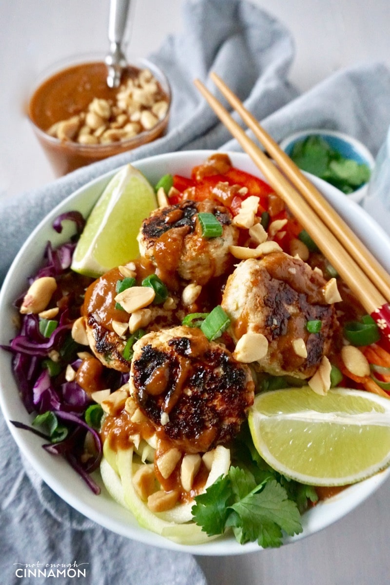 Thai Chicken Patties Veggie Noodle Bowl With Peanut Sauce