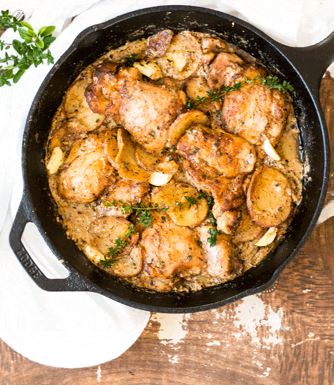 One Pan Creamy Garlic Chicken With Potatoes And Garden Herbs