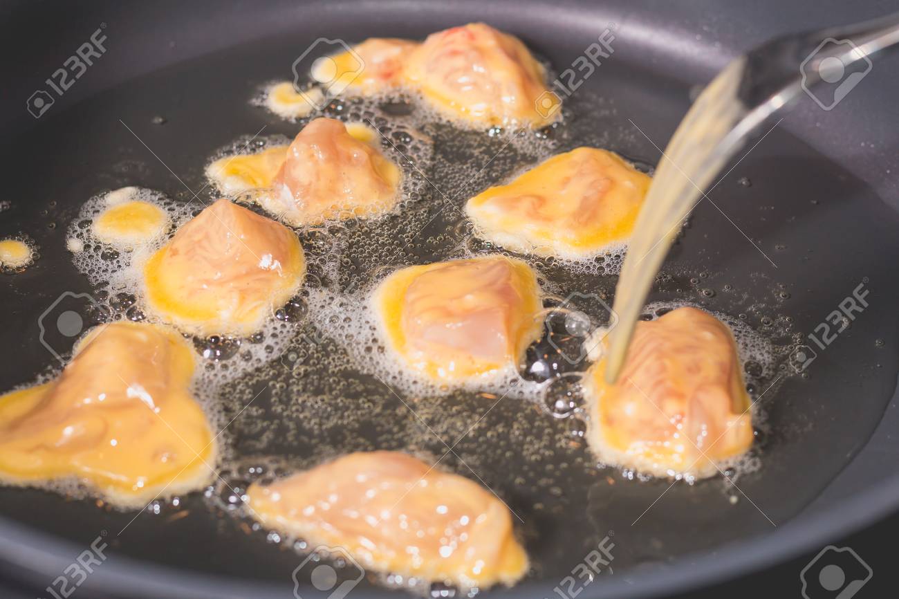 Cook Frying Chicken In A Pan Of Oil On Induction Plates